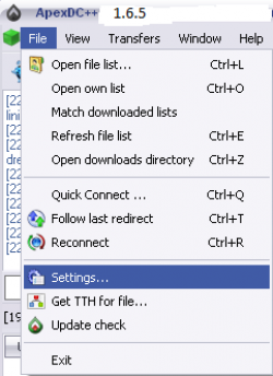 - Primul pas în configurarea programului este alegerea unui „ nick name “ care este de fapt numele cu care o sa vă regăsiţi pe huburi.Selectaţi „File“ apoi apasaţi „ Settings “ (imaginea alăturata).