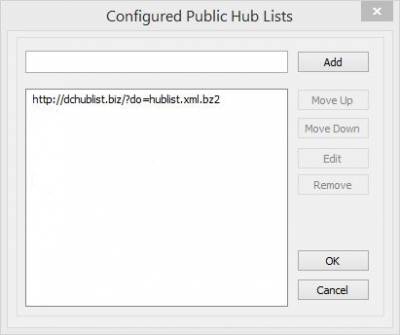 - se va deschide o noua fereasrea, acolo in a doua casuta selectati adresele existente si apasati “ Remove„ pentru a le inlatura. Dupa ce ati inlaturat toate adresele cu huburi din strainatate copiati una dintre adresele de aici (preferabil din RO) https://dchublist.biz/?do=hublist&get=hublist-ro.xml.bz2 pe care o puneti in prima casuta si apasati „Add“. Aceasta lista va foloseste la adaugarea de noi huburi. Mai multe hublisturi gasiti aici: