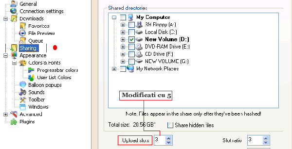 - 5 este “ Sharing „ . Aici trebuie sa punem si noi la dispozitia altora informatie ( ex. muzica, filme, jocuri etc.) pentru ca majoritatea huburilor pe care o sa ne conectam ne cer asta. De preferabil este sa dam share la cat mai multe fisiere. Tot in pagina de setari facem click pe “ Sharing „ ( imagine de mai jos ) si in partea dreapta ne va aparea sistemul nostru cu toate partitiile. Acolo selectam o partitie, la alegere, unde avem fisiere pe care am vrea sa la punem la dispozitia celorlalti utilizatori. Apoi apasam “ Ok„. Program va face hashing şi puteţi apasa „run in background“. Doar dupa procesul complet de hashing share-ul dumneavoastra va fi vizibil altor utilizatori Foarte important, tot in aceast meniu de “ Sharing„ avem o alta optiune „Upload slots“, care reprezinta numarul de conexiuni suportate pe calculatorul dumneavoastra, această valoare trebuie să fie proportionala cu numarul de huburi pe care sunteti conectat - cam 4 sloturi pentru fiecare hub, deci daca va conectaţi pe 10 huburi acest numar ar trebui sa fie de minim 40.