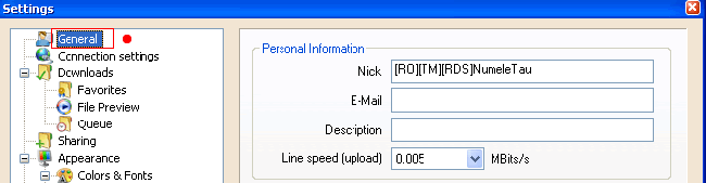 - În ferereastra nouă deschisă selectaţi „ General“(imagine de mai jos), la nick după cum vedeţi şi în imagine, se va scrie între paranteze pătrate de genul [RO][TM][RDS]Nume, unde [RO] reprezintă ţara, [TM] reprezintă prescurtarea oraşului dumneavoastră, [RDS] se va scrie providerul dumneavoastră de internet ( ex. [ClickNet], [UPC], [Orange], etc.). Următoarele trei căsute ( Email, Description, Line Speed) se completează opţional.