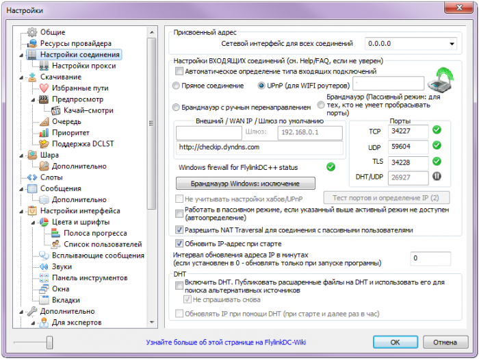 - Не учитывать настройки хабов/UPnP - не позволит хабу установить ваш IP для вас (иногда полезно на старых локальных хабах)